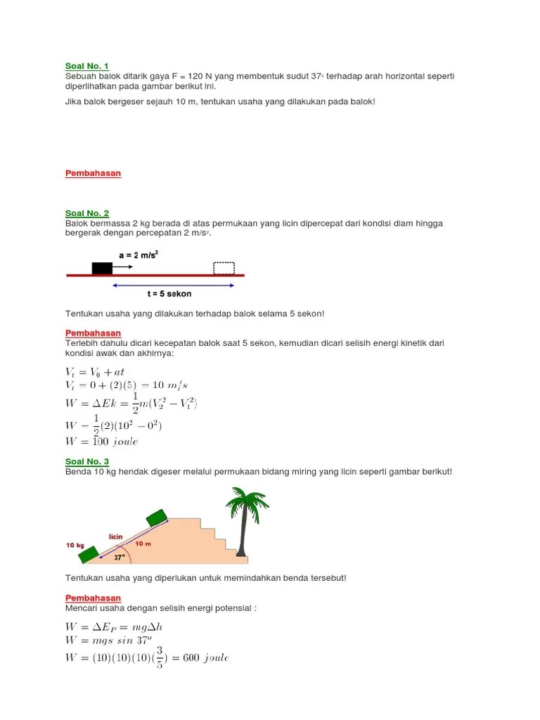 Soal Dan Pembahasan Usaha Dan Energi / 10 Soal Pembahasan Usaha Dan Energi Bagian 1 Ç Pilihan Ganda Aisyah Nestria / Pembahasan terlebih dahulu dicari kecepatan balok saat 5 sekon, kemudian dicari selisih energi kinetik dari kondisi awak dan akhirnya:. Pembahasan terlebih dahulu dicari kecepatan balok saat 5 sekon, kemudian dicari selisih energi kinetik dari kondisi awak dan akhirnya: Postingan ini membahas contoh soal usaha dan energi yang disertai pembahasannya atau penyelesaiannya. Get access to the latest contoh soal + pembahasan soal sbmptn fisika tentang usaha dan energi prepared with ujian tulis berbasis komputer course curated by . Dapatkah kamu menjelaskan mengapa kamu bisa melakukan aktivitas apapun dalam . Usaha oleh gaya gesek sama dengan perubahan energi potensial benda, .